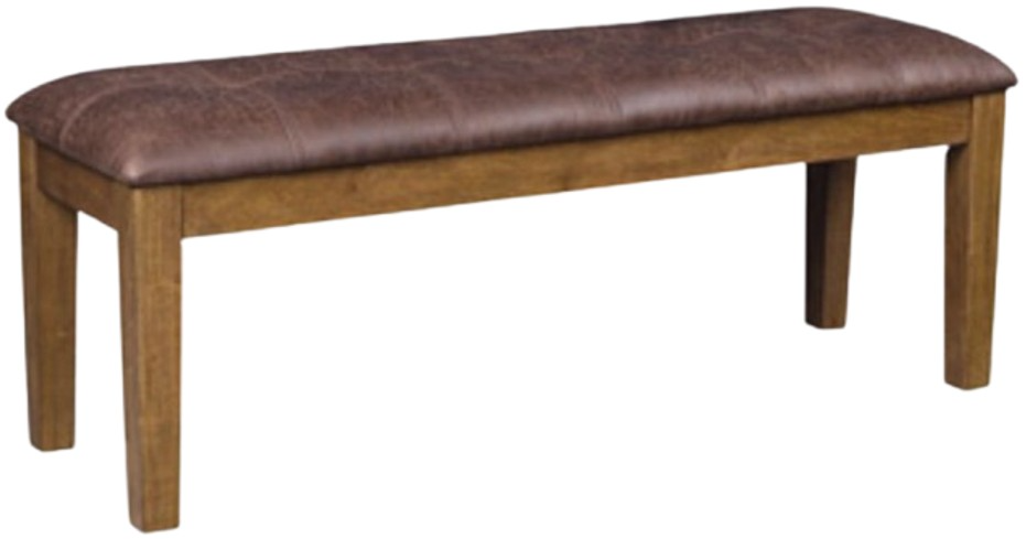 This generously sized dining bench delivers elegance with its warm brown faux leather seat perched atop a sturdy light brown wood frame, complete with burnished edges for a lived-in, cozy feel. Crafted using hickory veneers and hardwood solids, the bench seamlessly blends comfort and craftsmanship.Read More
